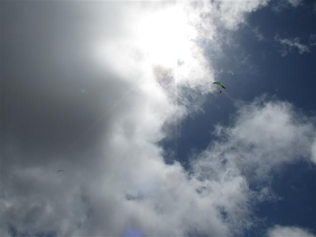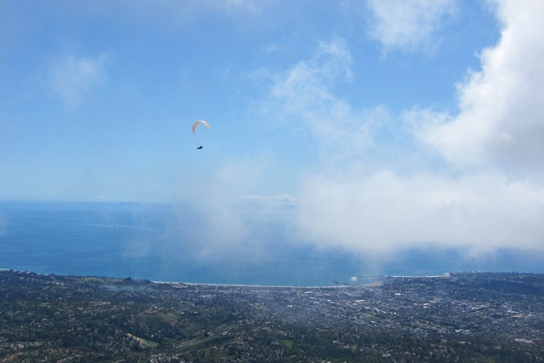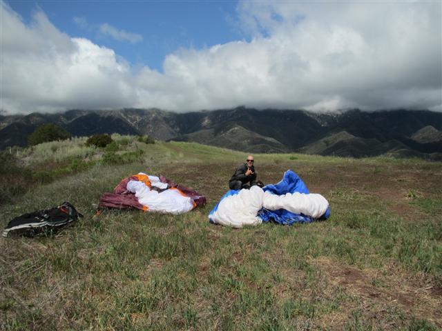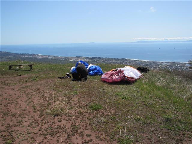 Dean gave me a heads up last night that he might come this way to fly Santa Barbara. Now, I've had several calls over the last 6 months from Dean stating things were shaping up, but I believe this is only the second day I've seen Dean actually show up. Yep it was going to be a spectacular day. Jim packed a very full van of work skipping junkies and we headed up the hill around 10:30. Conditions were good on launch with light cycles coming in and a relatively low cloudbase. Leeside Lee hucked first and seemed to be floating about without any effort at all. As more pilots launched into the magic buoyant air I was really jonesing to get going, but Mr. Stratton was standing on my tail feathers telling me to wait for even better conditions. It was painful to watch everyone enjoying the smooth easy lift and not be flying, but I held out till everyone had left and finally launched around 1pm.
