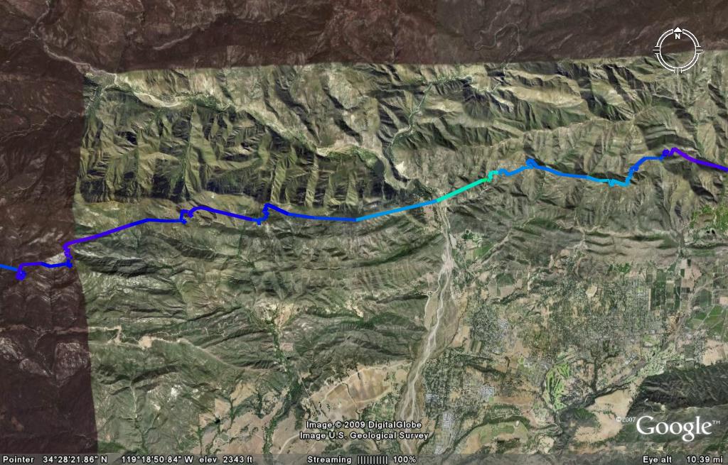 Anyway, east of Montecito all the normal spots were working just fine. Started playing with cloudbase just east of Castle Ridge. There were clouds to Whiteledge but Ojai was completely blue making me believe that the NE was scouring things out. Sitting at cloud base above Whitedge the thought was to perhaps turn back for an out and return. But the reports coming over the radio about the strong west near launch persuaded us to take a chance and continue east despite the blue skies. As it turned out we had a west wind all the way through the Ojai Valley. Again, all the normal spots were working, except Puckers. After climbing out to 5800 ft above the front point of East Repeater I made a play for Puckers for one last boost before heading over to Santa Paula ridge. Only Puckers wasn't cooperating. I had to bail all the way back to just below the front point of Boyds. There I picked up a low leaner that drifted me back to Puckers again where I had an eventual climb out to 4800 ft. Not as high as I would of liked, but it seemed like the day was shutting down so I left with that. Scot left even lower and ended up putting it down on the side of a hill near the college. I came in fairly low on Santa Paula, but as soon as I got over the ridge I hit a strong thermal. Unfortunately, it didn't take me very high. If I had to guess I'd say that the top was being sheared off by the same strong east that I encountered when I got around the corner. And the same east wind that was then knocking me down making me think that I was going to have to land up on the plateau. But it was also the same wind that allowed me to ridge soar an east facing cliff that gave me the altitude to make it out to the 126.