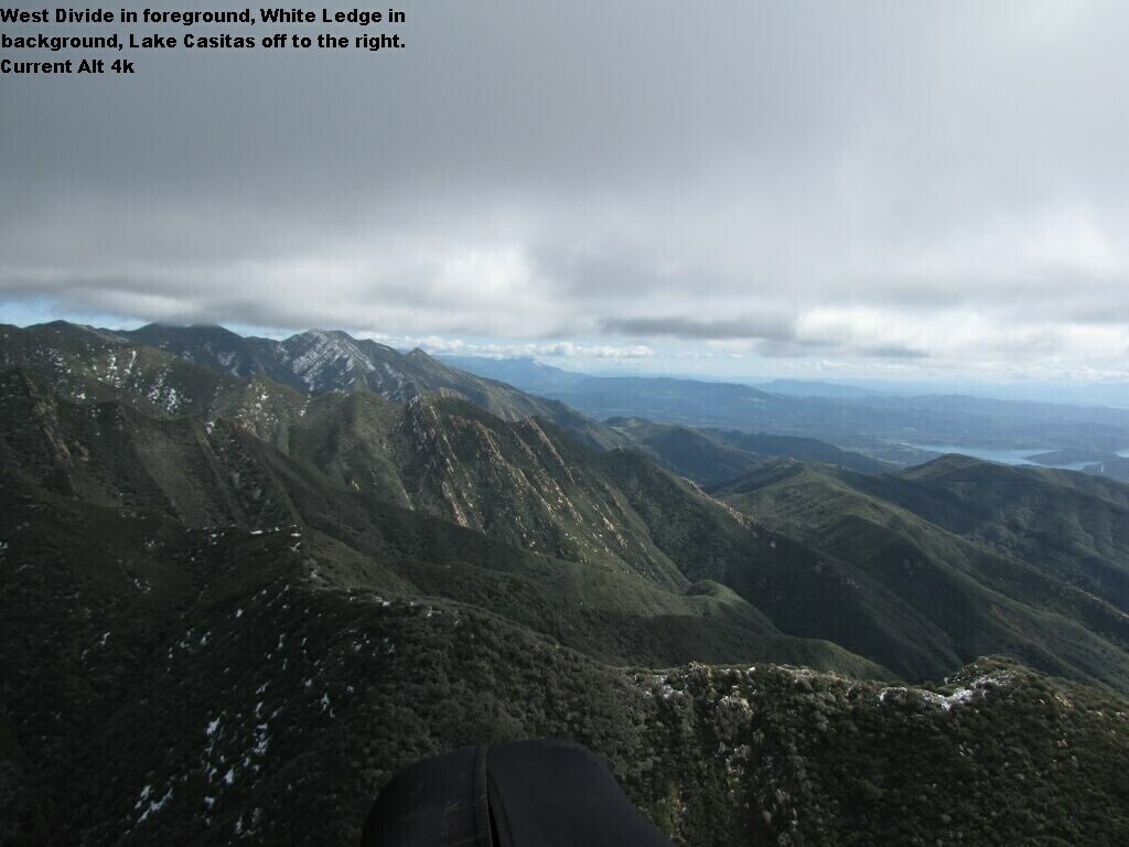 Wow! Let me say it again...Wow!! I think it had to be one of the best days I have ever flown. O.K. get to the flight. Well, I launched just a bit after Tony de Leo, so by the time I got up at Thermal Factory Tony was going through the pass at 4 grand.....rightttttt. O.K. so I'm a bit challenged. Anyway, was with a group of a couple paragliders at Montecito Peak and I mucked up a thermal, got low and they were gone. But don't worry, more PG's a coming and they did. I saw a couple get REAL low at Montecito but they got up and we hooked up and I was leading them until we got a couple peaks past Castle. The lift was still good but cloudbase was low, too low, but this dude and his buddy just kept going.... I don't know how he flies carrying around such giant cast iron balls but I didn't want to go there. It could be just an area of no lift and I'd be in the worst place ever. I don't think my tree cutting blade could cut through that forest.