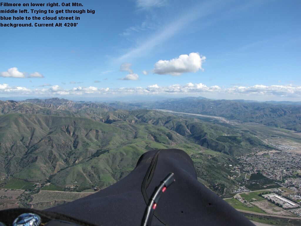 Today was a good example of how much timing plays a roll in your progress through the pass and beyond. Tony Deleo pushed out early, ripped through the pass and found himself in a huge blue hole in Ojai. He was just a bit too early to make the right connections in Ojai, so he had to deck it early. Had Ojai been working as it normally does, Tony would have been long gone, certainly well beyond the 5 freeway. Lucky for us, Bo, John Scott and I made it through the pass just before the cloud deck lowered to the point where it made it too dangerous for the pilots behind us to make the attempt. John Scott and I timed it fairly well through Ojai, but we hit a huge blue hole that extended from Santa Paula Peak to just a few miles beyond Piru. One more thermal and both John and I would have connected with the could street beyond Piru, probably bagging another 30+ miles. Instead we came up just a bit short. Just after John and I landed the gap began to fill in with cumi's, so I think John and I were about 30 minutes too early – bummer. Sometimes it’s all about the timing. Next time…