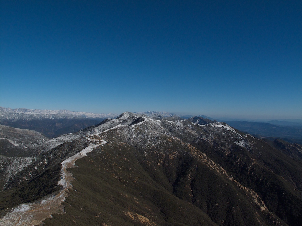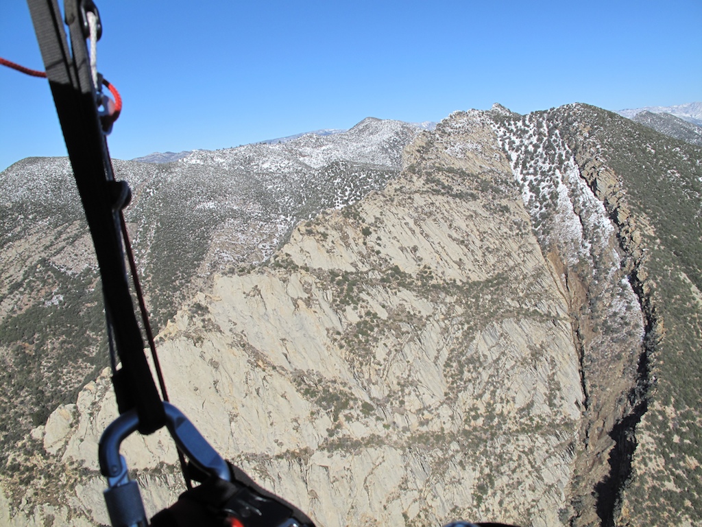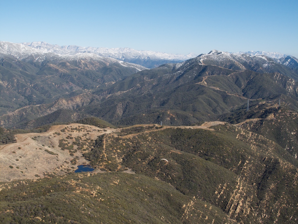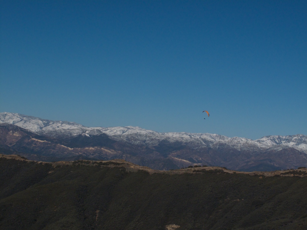 After nearly landing on the Round House a couple of times (sorry about the violations - I was desperate; didn't look like anyone was home), I finally caught one there that allowed me to start my three and a half hour trip through a magical Winter Wonderland. Kabir's pictures tell the whole story, especially with me being fifty feet off the deck. Kind of a stressful flight as I was not only the lowest pilot all day, but every single paraglider and hang glider passed me after I was the first to top out at Montecito Peak. It took me considerable time to get established at each of the usual trigger points. Much of the lift was out front on this day, with the thermals trailing off to the east and north significantly. I still don't understand what happened; it might be genetic. But I was doubtful about a trip through the Pass, since I really couldn't get higher than a little over four thousand all morning. It was a bit chilly for long overnight camping. When Brendan and Chris peeled off for Padaro, it got even worse. I felt I should follow them. But I was still in the game until the Pass, and others were skying out ahead of me. I was left staring at the familiar dilemma: "Man or mouse?"