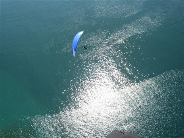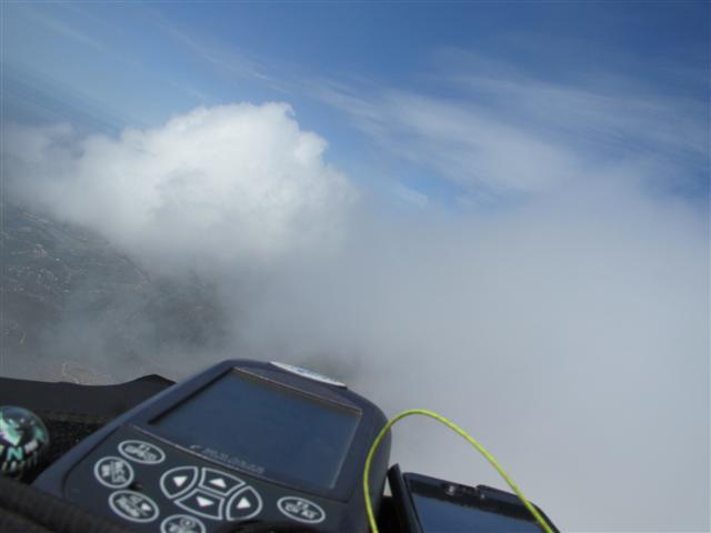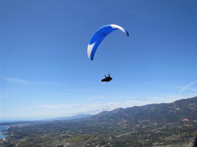 Tuesday was an Epic, cloud base touchin day here in SB. Got a ride up in the Eagle Van with a crew of dubious folks (some high level cirrus was hanging heavy on our minds in the morning). As we drove to launch, the blue sky prevailed and cumis were starting to pop over the range, with little show of wind in them. Cloud base was low, around 4000', but the lift was abundant and right where expected. I launched around noon, and got a nice lift in the house thermal. I saw Kev Howe at the RnR and considered going West to join him, but as I got up, he made a move for the Thermal Factory. So, why lone ranger I thought, and took off for the Factory. I struggled a bit getting into the thermal there, as it was in a different place then I was trying to make it be. But with Kev above and Chris coming over from launch, I was able to use the help of my friends to climb aboard. We quickly reached cloud base. I saw Howe making his move for Montecito Peak and I channeled my homie Brad Gunnuscio. It's all about timing and commitment he says. So, I took my altitude and headed out. Kev wasn't getting much love, so I aimed for Shadow instead. I saw a beautiful cloud shadow and sun line on the ridge, and went right for it. The little bumps and beeps greeted my nicely, and I was hooked in to cloud base again. Chris was hard on my tail, and it felt great to have a buddy. Kev was working very hard, and I looked back to see him get out of there and touch the base. Each time I got to the clouds, and was still going up, I peeled out for the next cloud shadow/sun line on the next ridge. Every time I was greeted with reliable, strong lift. Chris and I worked together this way and eventually Kev caught up. The lift was disorganized low, but if you persisted in it, it got stronger and stronger. There were some pretty intense waterfalls, and the ocean side of the clouds were pretty turbulent although I only took one tiny wingtip along the way. I gave many thanks this day to my Summit XC2, which is so solid and makes me feel at ease in 'some of the spankiest SB conditions'. (I also gave many thanks to my new ratcheting speed bar pulleys, which made my bar mashing effortless..this was their maiden voyage). The three of us linked up and I spent much time looking down range...to Ojai or to not Ojai, that was the question. I saw the crux of the flight coming up, with committed, deep lines and NO clouds. On a day when clouds are abundant it didn't feel right to to push into the blue abyss. My hands were cold, and it was time to move out. I put on that bar and headed for Padaro. The glide across was amazing, I hit a few super strong thermals along the way that almost teased me into turning in them. But, my bladder got the best of me, and I held course. I kept looking over my shoulder and saw Kev and Chris make the move as well. I came into the beach at Padaro with 1400' and got to enjoy the breathtaking scenery while the other two joined me. We landed effortlessly and heard that Ty and Aaron were shortly behind us. A happy crew of five, eating nachos and chicken sandwiches at Padaro Beach Grill. This is my second time making this flight, and it was done in 1 hr 7 min from launch. Pretty quick business. My max altitude was 3875' and max lift 875 fpm. Definitely the strongest I have encountered in SB. What an amazing milk run! Can't wait to do it again, maybe next time with Ojai at the end ;)