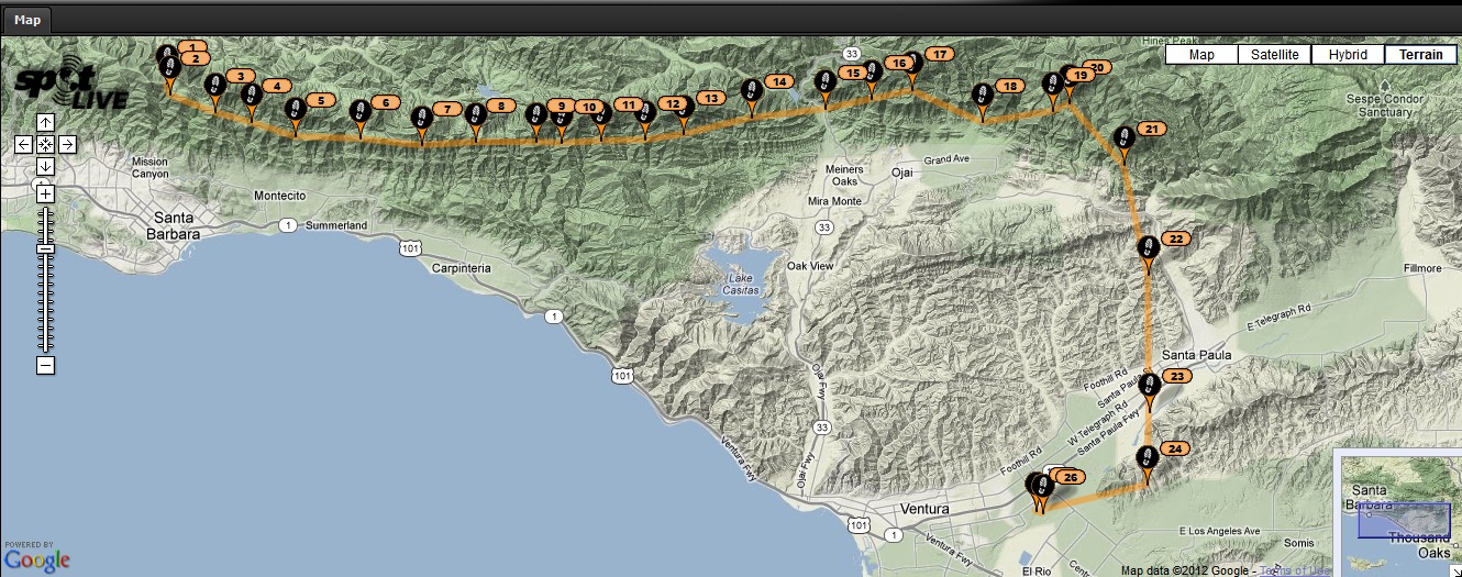 caught the full eagle bus up, up and away to ej bowl. andy jumped off quick and had an amazing glide to the peak gaining altitude the whole time. so us lemmings soon rolled off too. floated around the peak and altenator nice and high for a while with bob a., jon blake, master bader, and lompoc joel. headed east from there skipping peaks as we were specked out. it seemed we had a bit of an east wind up high all day. bob a. and i got stuck bobbin around ridge level at the powerlines for a while, where hammer and howser met up with us. doug found one, turned and headed back west. we finally got a fine piece of ass up over 5. bounced through the pass between 5 and 6(the info people have shared lately worked like a charm, thanks!). i must say i was pretty stressed out through the pass, dont know how often my brain can handle that. good times, and pretty easy going this time. i was stress beat by the time we got to the bump near the 33 so headed to the high school with bob a and howser. super fun flying with friends. finally got through that dam abyss on my pg. you guys are gnarly that go through that thing all the time. speaking of which, andy and chris paul were way ahead up us where chris made santa paula, and andy got up at sulfur mt, then glided across the valley back to nordoff high school. i hope they post their tales. lots of awesome flights,,, j blake went almost to the power lines and out to padaro(in his words because he got 'bitch slapped' back there,,,lol!), master bader flew to carp, lompoc joel went la cumbre to monticito peak and back to parma, doug probably made an out and return to the powerlines, tons of people high and to the beach. thanks so much to jon blake for the retrieve and to chris paul and howser for fetching the van. i forgot my camera today so only have a tracklog