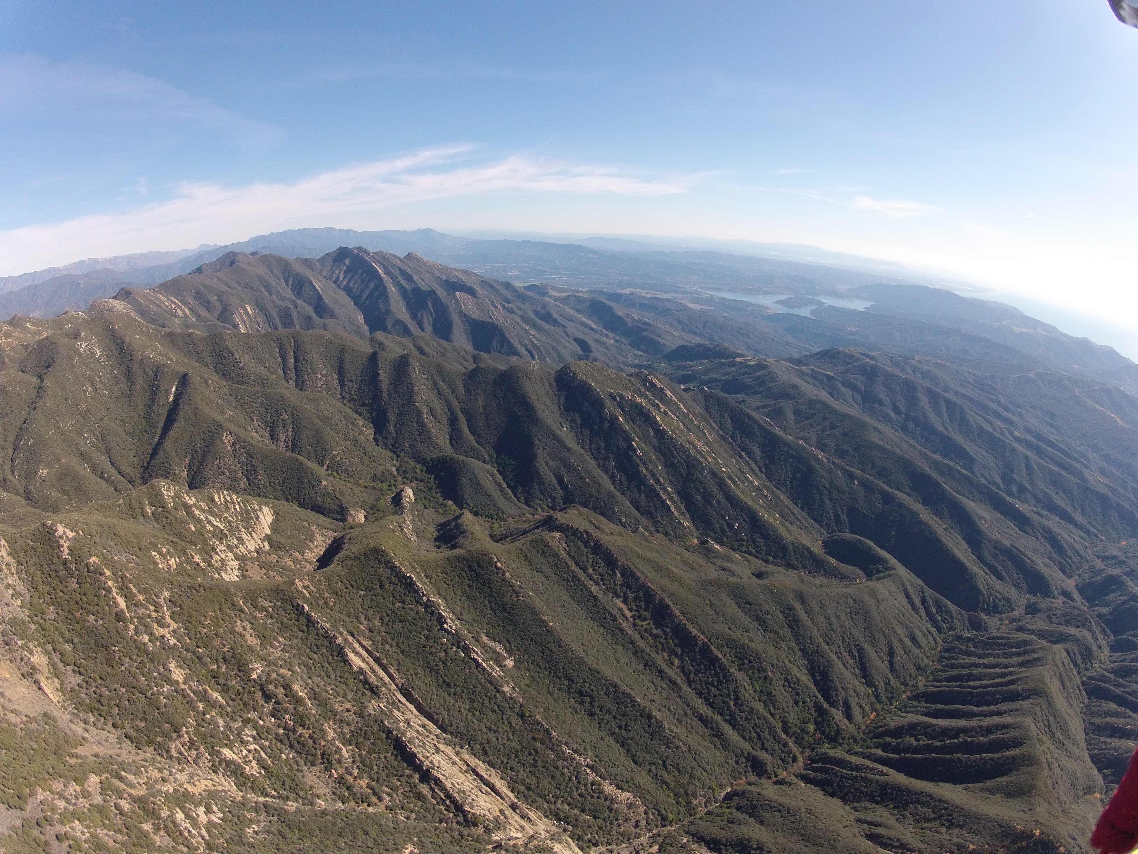 Less than a dozen of us rode in the Eagle van ahead of the FAA van. It was blowing in at both Skyport and EJ's. We started launching EJ's at 10:40 AM. I turned right to La Cumbre Peak and within minutes was near the wispy's cloudbase at 6,300 feet. I headed east and picked up Andy Dainsberg at the R&R. He can relate how he scrambled and hitch-hiked to make a similar launch time to mine. It only took seven thermals to make it through the pass to Ojai: La Cumbre, Montecito Peak (6,400 ft), glide all the way to Powerlines where Mr. Monster boosted us back to 7K, Noon Peak, Divide, White Ledge and Bump 2 - all in the high sixes. Andy took the back ridge after flying mostly out front to the Powerlines and I took the middle road. It was the perfect day with lift everywhere and a tailwind giving us ground speeds of 25-35 mph.