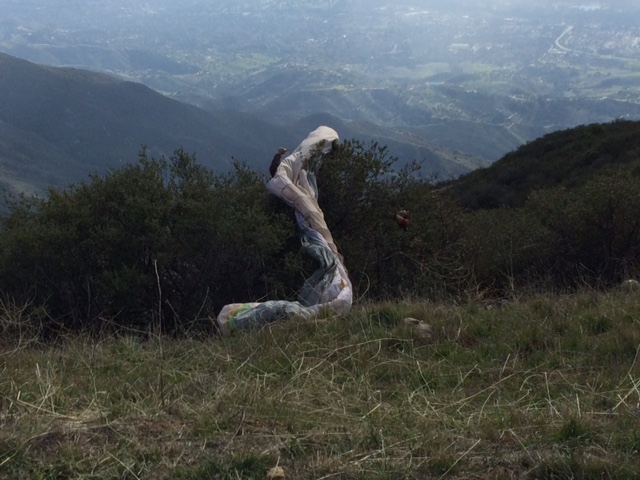 So there I was slowly making progress toward the VOR launch where I was excited to top land. Aaron was just behind me and I couldn't believe we were going to make goal....especially since the ceiling of clouds was maybe 20-30ft above launch or lower. I guess I was so excited about landing there that I came in rather low, with little or no bailout option. I was also heading down wind. I thought I'd be able to come down wind, turn in and land. As I was just approaching the last bushes before the launch, I hit a pocket of sink and realized I had two options, piling into rocky earth or scraggly bush. I chose bush. I crunched in rather hard and my glider swiftly flew over my head and landed in the next velcro like bush. I think I stunned the three pilots that we're sitting there waiting to launch. Sorry Bader.