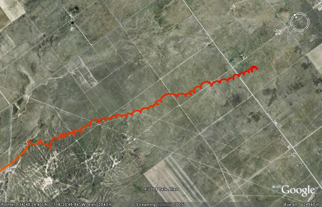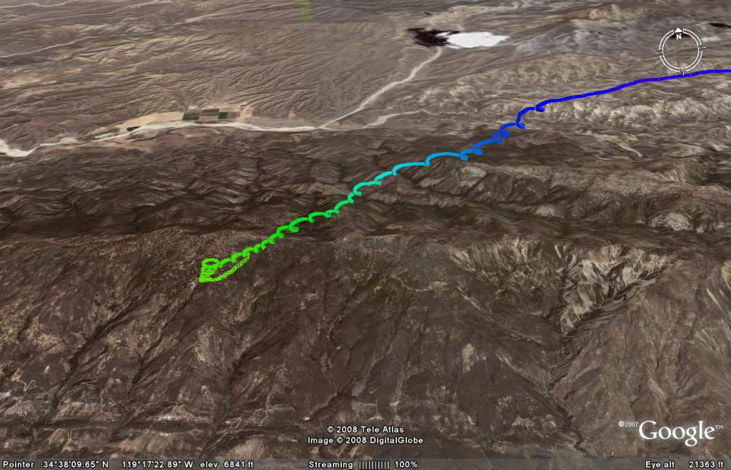 Disappointing day for me. These type of days don't come around that often, especially on weekends, so you need to take advantage of them when they do. I didn't. Left the mountains west of I 5 above 14k, but never found anything better than 0 sink out in the Antelope. Spent the last 3 1/2 miles turning circles 200 ft off the deck before finally giving up and landing just west of Lancaster (56.89 miles). Both Tony and Robert flew off of Frazier and took a more northerly route than I did out in the Valley. I split the difference between Frazier and Alamo and then crossed the north side of Quayle lake to the north edge of Neenach. Angled low over to Fairmont Buttes hoping that the relief might help out. But I when didn't pick up anything out front I knew that that would be it as I would be in the lee once on the other side.