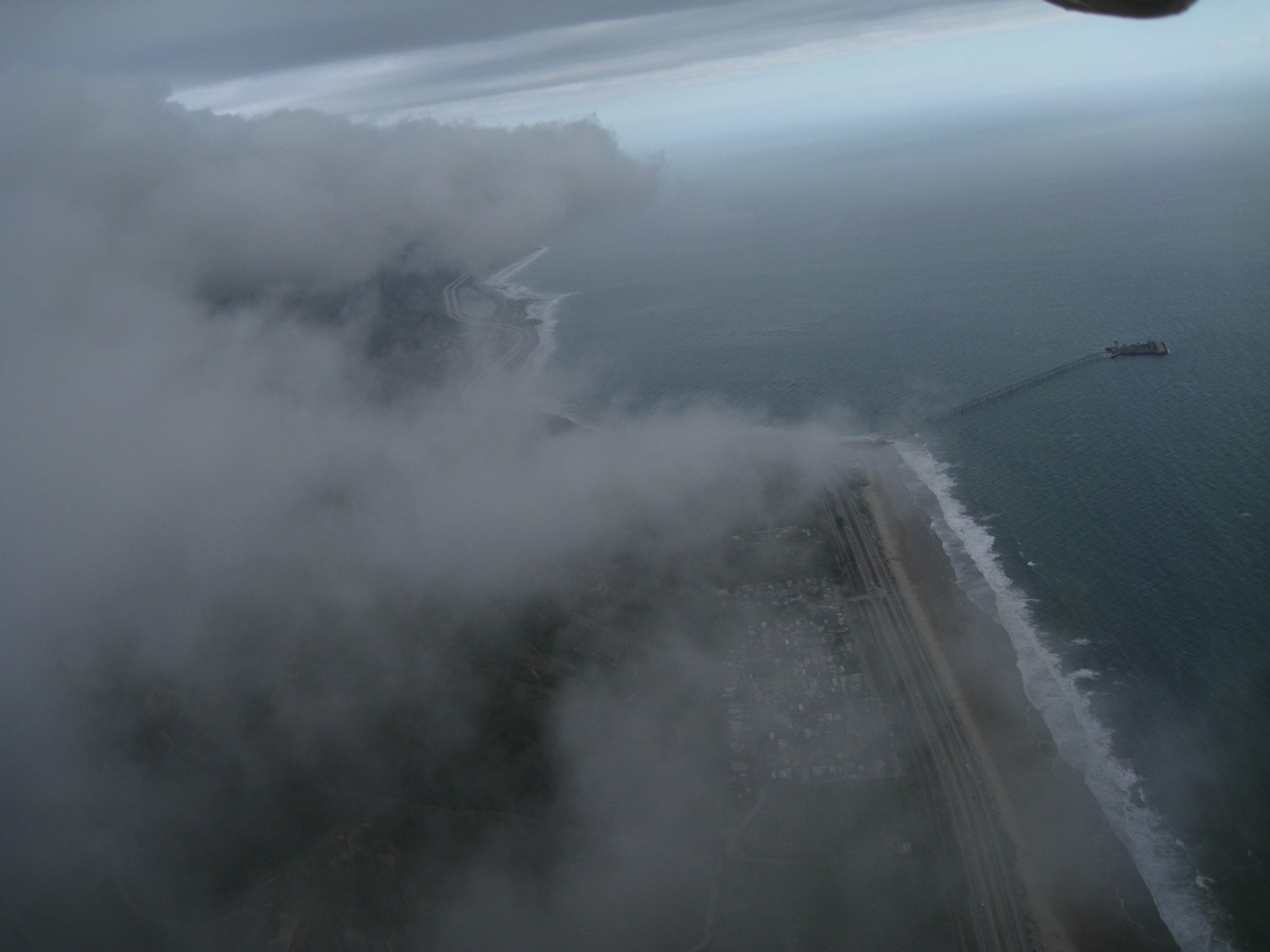 So, as it gets more crossed during the day the lift wanes so there is the timing of the increased wind stregnth before it crosses which is the go time. Hammer got it early, then it got a bit crossed and we were stuck, then the wind straightened out again and we all started getting up and it was go time. So, what heighth to leave? I had 900 feet off the beach and the wind was pretty straight, AND it was low tide. With the wind being straighter I didn't have to go as far around the point. With a more cross wind you need to go farther around the point to avoid the mechanical turbulence. The best thing to do is to fly Bates some more to get a good feel for it. Get your radio and PTT working and bring a cell phone. Try to go with someone who has gone before. I also would prefer to do that flight with a higher performing wing. It was fun and novel with a single surface but a better wing gives you more options, a better sink rate, more penetration, and is a lot less work when searching out the lift band. Try to do the flight with a low tide like we had. It gives you more options for landing. All, you do when you leave is to go downwind to the first part of the cliff in La Conchita and when you here the beep turn into the wind. I like to do a few 360,s in the first lift I find and drift back a bit with it. The fight itself isn't very hard technically. The big deal is keeping an eye on the changing conditions and the wind stregnth. Hammer mentioned to me that I might want to land at the overhead instead of flying to Ventura where the wind strenghth might be too strong for me. It wasnt' too bad on this day but you might want to keep that in mind too. You want to be clear of any obstructions when landing in strong wind. Don't go behind and structures. I through in the towel a bit early and hovered down at C Street at the point so I could be clear of any structures. You want to make darn sure you get a decent LZ and don't get caught leaving that last good landing zone trying to go a bit further.