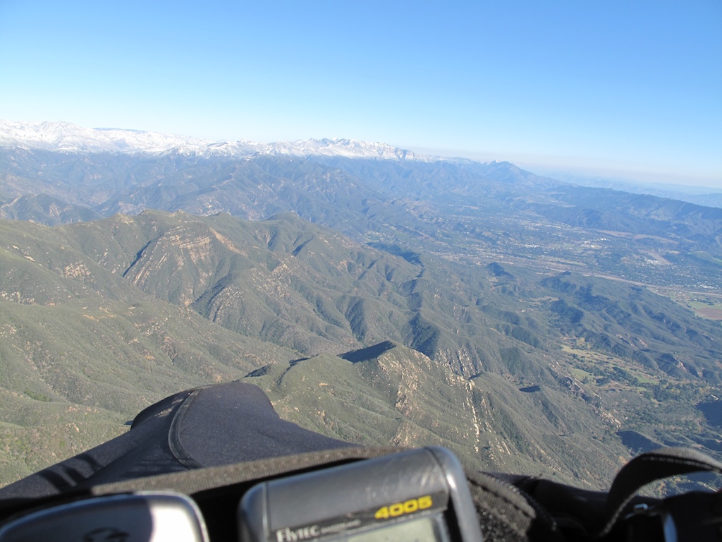 After nearly landing on the Round House a couple of times (sorry about the violations - I was desperate; didn't look like anyone was home), I finally caught one there that allowed me to start my three and a half hour trip through a magical Winter Wonderland. Kabir's pictures tell the whole story, especially with me being fifty feet off the deck. Kind of a stressful flight as I was not only the lowest pilot all day, but every single paraglider and hang glider passed me after I was the first to top out at Montecito Peak. It took me considerable time to get established at each of the usual trigger points. Much of the lift was out front on this day, with the thermals trailing off to the east and north significantly. I still don't understand what happened; it might be genetic. But I was doubtful about a trip through the Pass, since I really couldn't get higher than a little over four thousand all morning. It was a bit chilly for long overnight camping. When Brendan and Chris peeled off for Padaro, it got even worse. I felt I should follow them. But I was still in the game until the Pass, and others were skying out ahead of me. I was left staring at the familiar dilemma: "Man or mouse?"