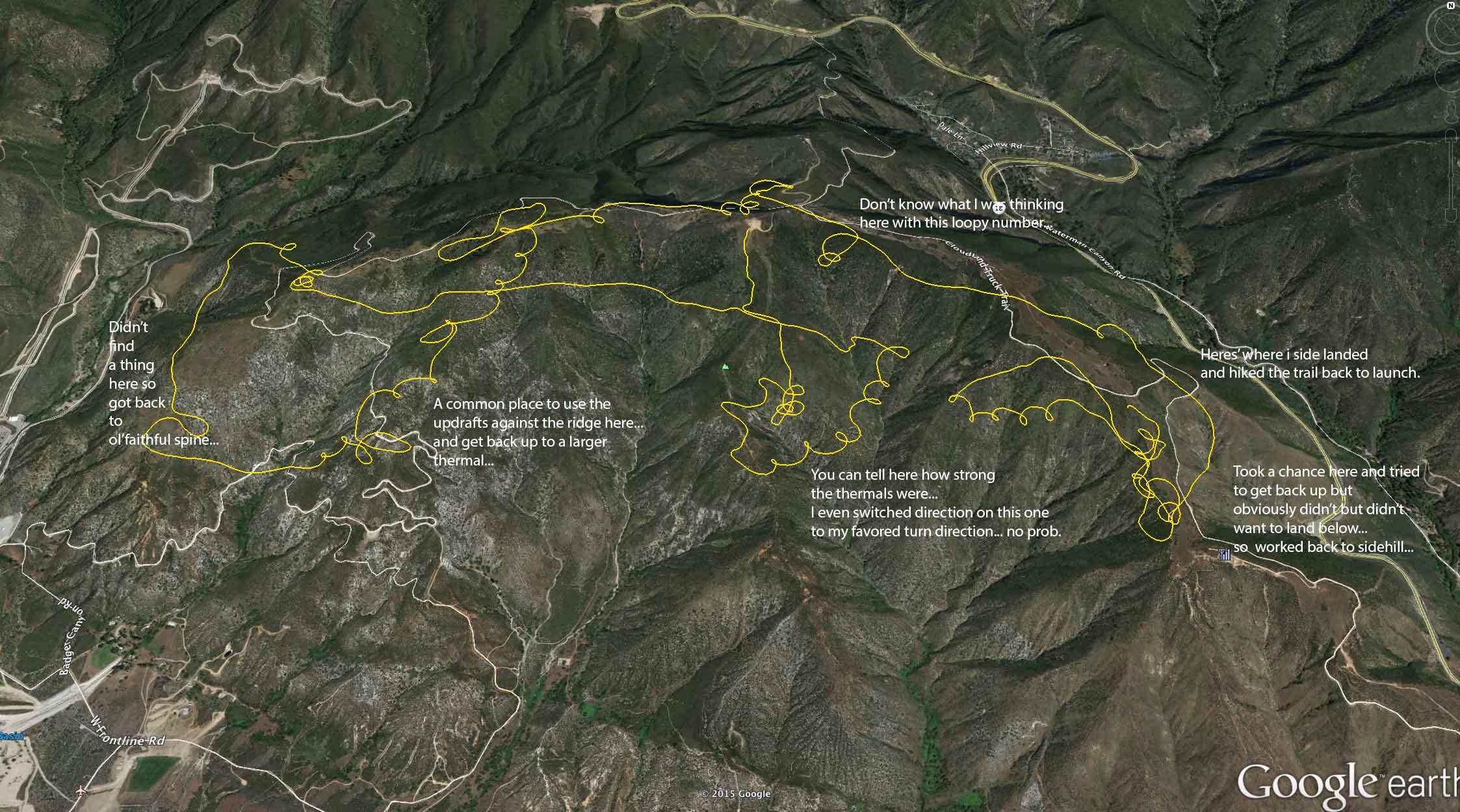 Thoughts: My goal was to overcome my tendency to listen to my fears screaming and drowning out my logic causing my flying performance to tank. This was manifesting itself in me bailing out of thermals, not staying in thermals, and not allowing myself to climb as high as I should have been in many cases. (flight logs show an uncanny thermal height where I leave the thermal so as not to get higher). You can overcome mental blocks with simple concentration on what is true, and not what you are feeling… Today was a small victory in that area. I had a goal to reach 1,000 over launch, which I got in my first thermal, and actually got to 1,500 over… so probably should shoot for 2,000 ft. next time. (Marshall peak is about 4,000, and 6,000 is pretty normal from what I’ve seen in the summer). I also wanted to trust myself to get/stay in thermals and not bail when it got bumpy, and today was very active…but I stayed with every one to where I couldn’t anymore… it was a great victory for me there, and a place to drive a stake in the ground.