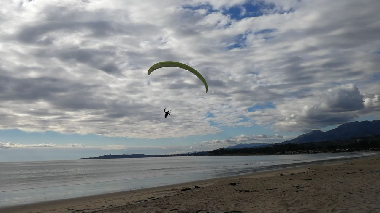 Leon Roullard in front of Polo Ridge on glide for landing at Padaro