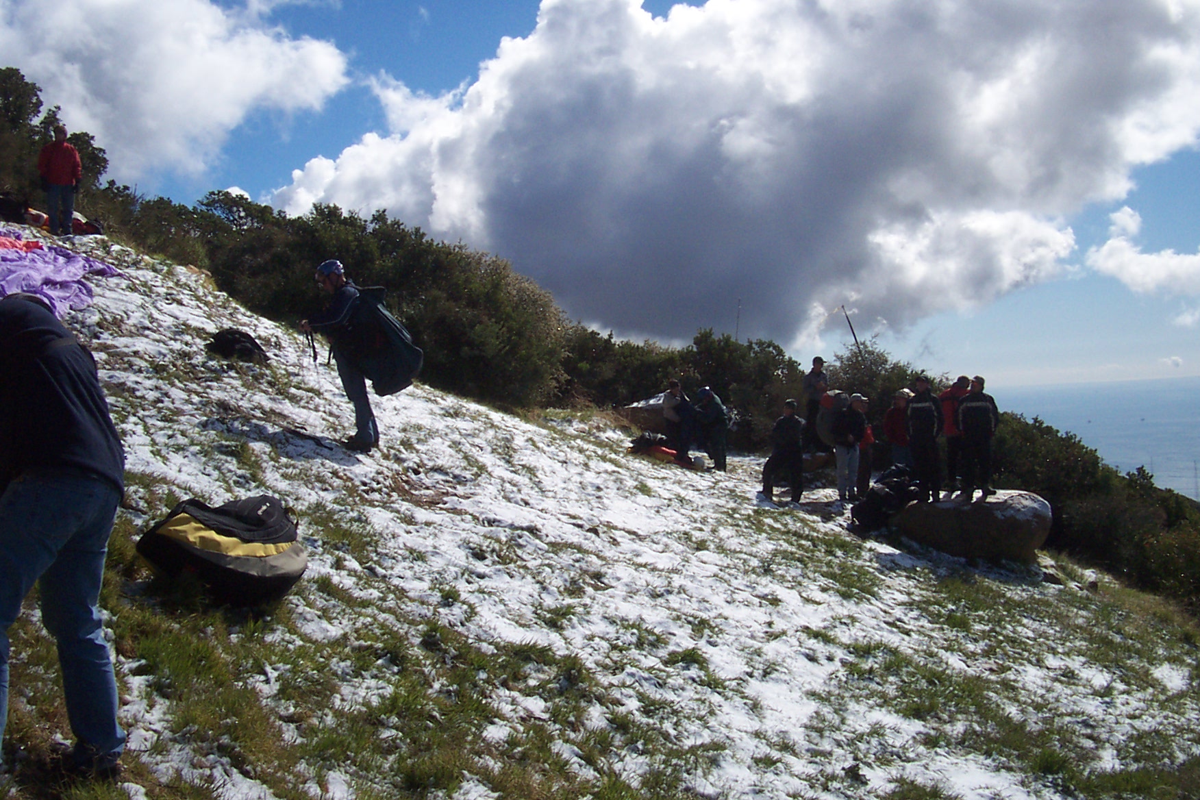 Big crew, as per the usual these last few weeks. Arrived at launch around 10:20ish with big cumis out front but somewhat limited ground heating. Sat around for a while at launch, amusing ourselves with some snowball throwing, and some even decided to drive down. Dean and I didn't feel like waiting around any more and launched in a particularly dark looking part of the day. Not much to be had until I got to the antenna farm. Went straight to 4k and cloudbase. Unfortunately there was a bit of a west wind up high, and more than a bit down low. Decided to go for the beach since I couldn't feel my fingers or face. It went relatively well until I arrived at the freeway. It became increasingly apparent that there was a raging wind on the surface. GPS showed 2mph into the SW wind. Landed vertically. A bunch of others followed me out including some HGs. The lift was great, but conditions were a bit weird and the hard west wind made it a bit questionable.
