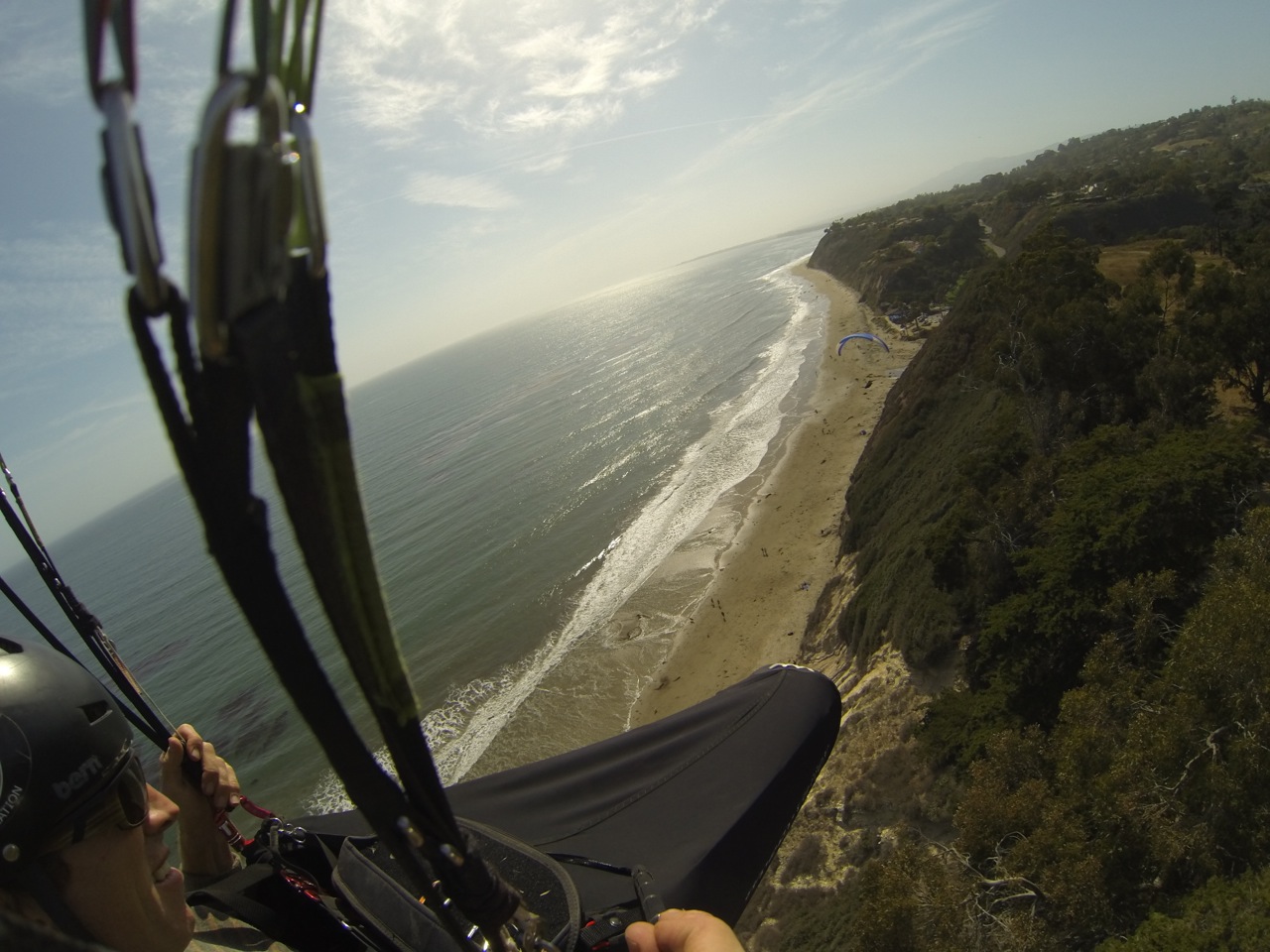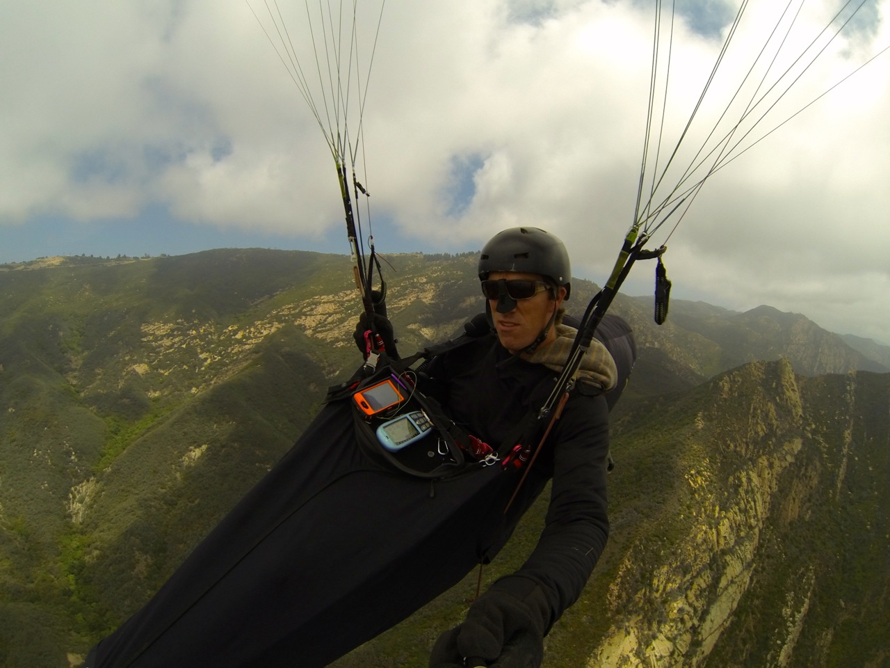 howser, bobA, and i loaded up at my house at 9am for a weekend in mammoth of ski, bike and fly. the conditions looked marginal for all three and there and clouds were starting to pop in our hills so we headed to parma to get a flight first as this low pressure system is still upon us. beautiful clouds popped everywhere and we bounced off the skyport trampoline to cloudbase. cb was just under 4k. took a leisure stroll with willy on his hg down to painted cave with pleasant conditions. heading back it got funky, i think both the lower south wind and upper north winds were getting strong making conditions interesting. i had a first with dropping my camera when i got rocked on one of them. not sure if i threw it or dropped it, but i did let out an, 'ohh gawd!' as i got rag dolled around trying get my glider under control. its always interesting to see if your backup works as i peered over my harness to happily see my camera swinging far below me on a thin peice of line. i threw in the towel at westbowl as i was in a stiff east wind and didnt like the conditions. heading out wasnt anymore pleasant with lots of big ups and downs. found some 500 down around cocapaw, put it on a tip and spiraled to the deck at the back of cochapaw for a most appreciated non-turbulent walk out. i think willy flew around for 5 hours yesterday, that guy rips and he dives for the most unusual triggers and seems to get it every time. grabbed bobA and chris at the beach and pondered our plan at the Habit. it was blowing steady like a seasoned porn star so we went and soared wilcox for an hour or so. since we defaulted for a staycation and already had the bikes loaded up, we drove up to knapps(snyder trail) and dropped down the backside for a gorgeous sunset ride to paradise road. love those santa barbara staycations! git sum!