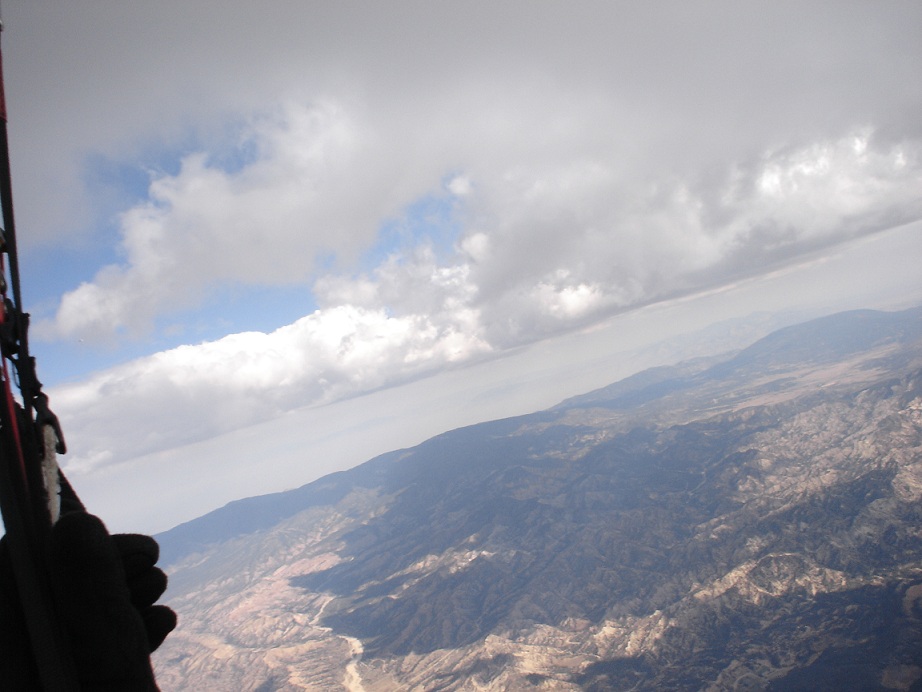 The Cobra launched nicely when it was hooked up correctly and I entered the thermal of a lifetime about thirty seconds later. How big was this munificent thermal? God only knows. The only way to put it from experiencing it myself would be to say that it felt more like the whole earth fell away rather than the thermal lifted me up. BIG, yes, but with a kind, smiley face written all over it - not scary at all. It bode for a very decent day, but that wasn't to be the case. This bad boy, suma wrestler-sized thermal zipped us up toward cloudbase in no time. The sky was rapidly overdeveloping in places and we looked to the Lockwood Valley for step two. But my thermal wasn't done with me yet. It took me to an incredible 17,999 feet before I (finally) located some sink to turn in. With an 18,000 foot ceiling for our aircraft, it will be a lifetime best in altitude. And right over launch, not 15 minutes after takeoff. The predicted 18,000 foot temperature of -13 Celsius seemed fairly accurate to my exposed face. But I wound my way down to a more reasonable 16,500 feet and headed eastbound.