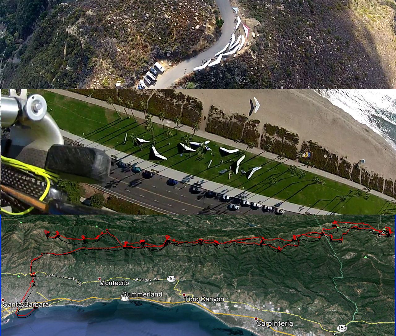 Got up at 330 and 545hrs checking La Cumbre and Montecito winds each time and the day looked to be worth the drive. Picked up sd at 905 then BobH at the beach then RonF at Parma and bee-lined for Skyport. It was nice arriving early and being able to relax while setting up. I needed extra time to re-rig my tethered camera. By this time all available hang glider assembly room was in full overlap mode. I hucked off at 1048 probably 20 minutes after my 3 PG fares were under wing. The Sylmar gang headed farther up the road to get their 4 or 5 wings assembled thanks to Fast Eddy's fast thinking.