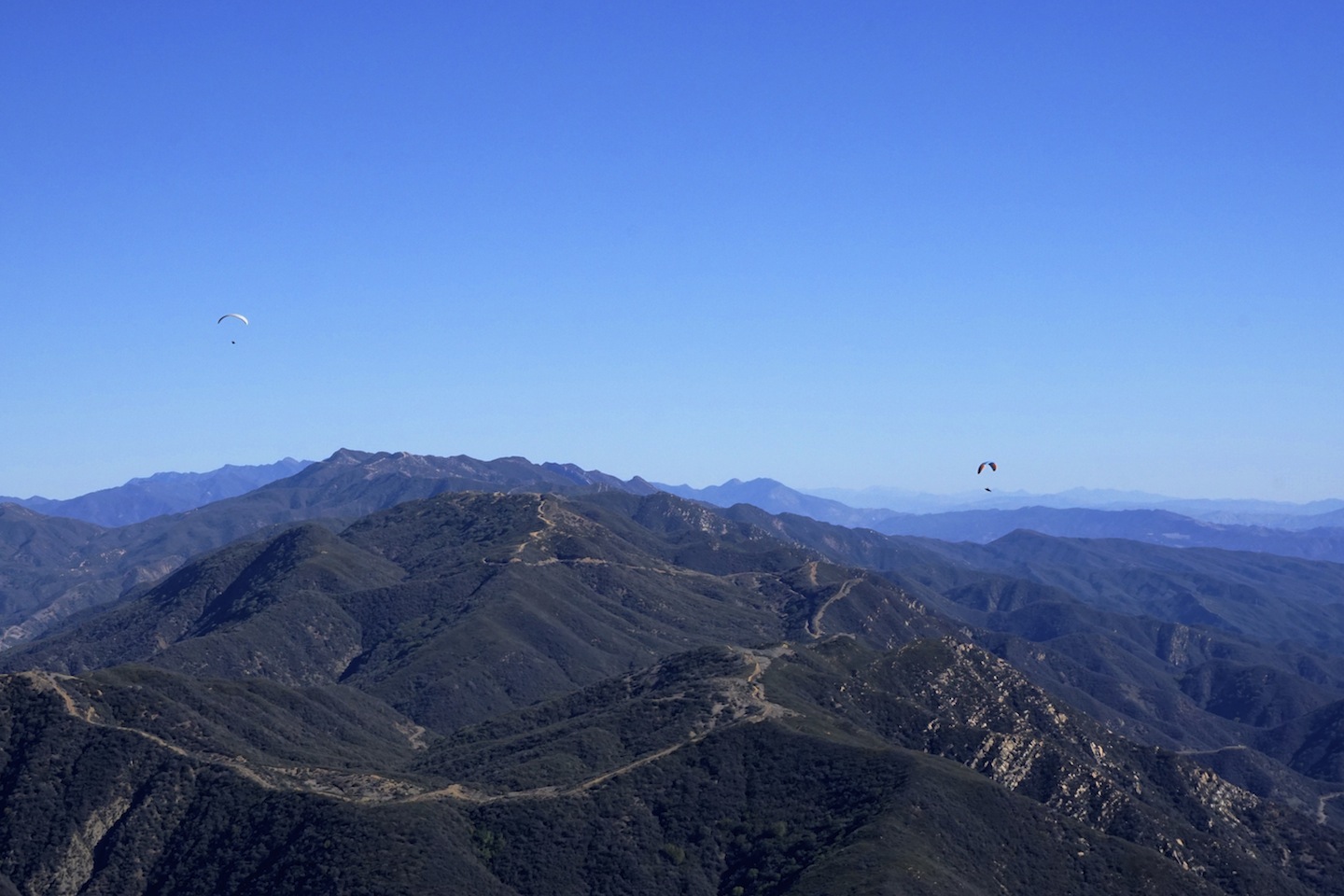 Everyone got off ok, but the early cycles were light from the east. Midway through the launch queue it clocked around to come straight in with a little more gusto, maybe 5 to 8 or 9. Aaron did the early (11 am) light cycle cross from the east honors followed by Chad. The first gaggle got up good at launch then higher over La Cumbre Peak before rounding the VOR turn-point. Aaron turned at Divide Peak on his eastbound leg and got back to Summerland on an upwind glide. Neal and Tim Barker went to Ojai with Tim having a plumbing issue that took him out of the mountains with good altitude to land at Nordhoff High School in light wind from the south. Neal ran into a headwind from the east before fizzling at Thatcher School about 2 PM.