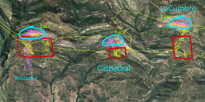 Notice that the Yellow track, was getting nice thermals right in front (200-400 feet) out front of the Faces of Westbowl and Cathedral, whereas the purple (uh that'd be me) was using the faces to maintain.