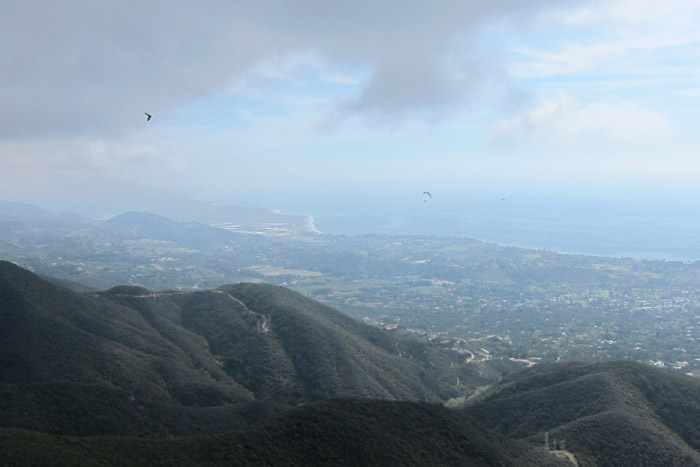 only 4 junkies showed up for the fly above all van. weird on a sunday. hammer, lj, and an out of towner were launching eliminator by the time we got up there. cloudbase varied from 2600-2800 and pretty dark everywhere. bo and i jumped off and he headed to antennas and i headed to parkers as i kept losing visual of everyone in the white cheddar. my eyes soon went fuzzy at parkers so followed the compass east. hammerhead(returning from westbowl), alBOtross and i all joined up at monicito foothills about 2000 feet. ad-venture time! we all kept yo yo'in down range. i was bouncin between 1800-2500 and those two were staying slighty higher. i somehow dropped anchor for some time between romero and castle and made a mistake of leaving zeros and chasing two climbing hawks behind me. well i think they read a different book then me and i soon was less then 1400 and looking for an lz. i was setting up for a big backyard and got a burble that drifted towards the ocean and spit me out right on top of Birnam Wood golf course behind summerland. kept milking hawk farts hoping for one to get me over ortega hill to summerland beach. but never got anything that smelly so landed on the hole 9 fairway. thanks to Pete for swooping me up. Justin made east beach, alBOtross made bates, and hammer made mussel shoals. fun day in the foothills with 7 pilots total landing at 5 different LZs.