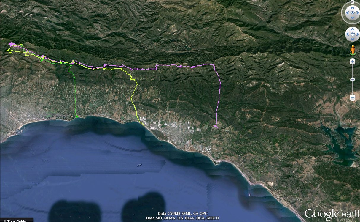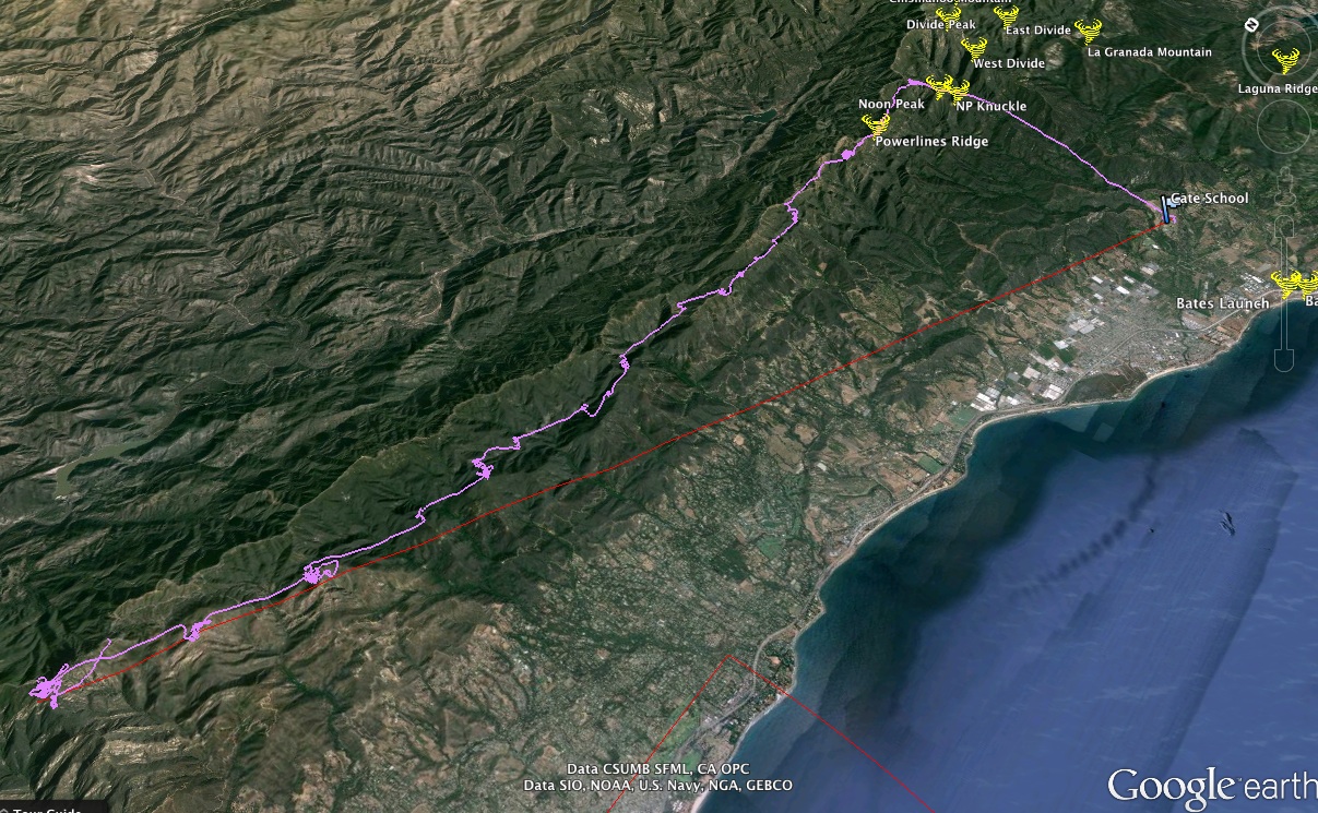 Numerous other pilots went east to about the Power Line Crossing, but opted to fly out rather than reaching for bigger altitude eastbound over the higher peaks through Casitas Pass. The lead gaggle got into the mid to upper 6s over Divide Peak. I think at least a few pilots had their personal longest flights eastbound.