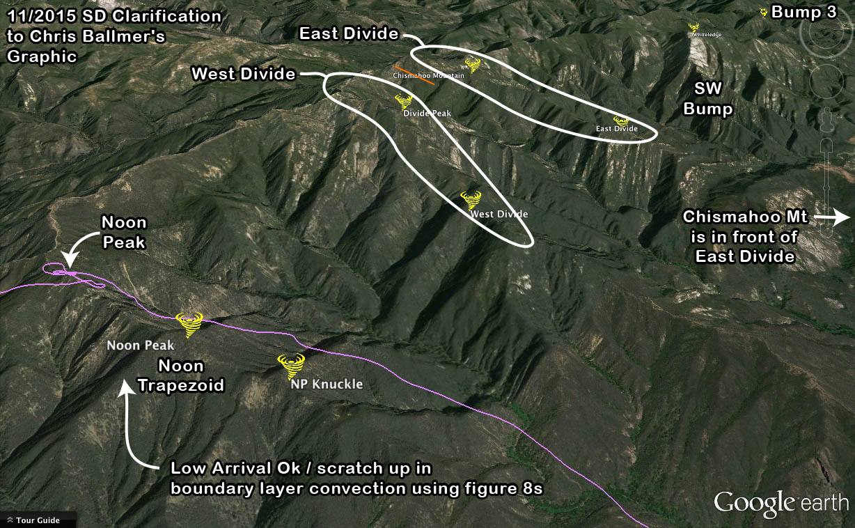 - starting to get a pattern is helping... it's kinda getting into my brain. I've been known to wander, and still do, even on this trip I took a couple chances on some places I though might be producing, weren't, and set me back mainly some time. But, the patterns work... stay over trigger/peaks and spines and you'll be richly rewarded. AND bonus is you can also score on some random thermals breaking off in valleys sometimes to boot, but just in transitions.